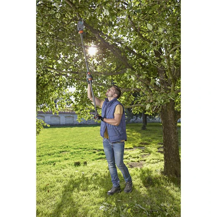 sonstiges: Schneidgiraffe zum Schneiden von frischem Holz, Gesamtreichweite mit Benutzer ca. 350cm, Schneidkopf vom Boden aus um ca. 200 Grad abwinkelbar, extra leichter und schmaler Schneidkopf ermöglicht auch in Stammnähe ein komfortables und zielsicheres Schneiden, präzisionsgeschliffene, antihaftbeschichtete Messer reduzieren den Widerstand beim Schneiden und sind leicht zu reinigen, Ziehhülse mit Abrutschstopp und ein zusätzlicher T-Griff sorgen für eine angenehme und sichere Handhabung und noch mehr Reichweite